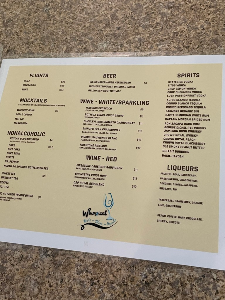 But once you walk into the door of Whimzical you’ll quickly find that this place IS cool. Let it have all the Z’s it wants! Silent Z’s, Capital Z’s, Z’s where vowels should be. Name it Zhzmzzczl, and it’ll still be my favorite restaurant in Downtown Newnan.